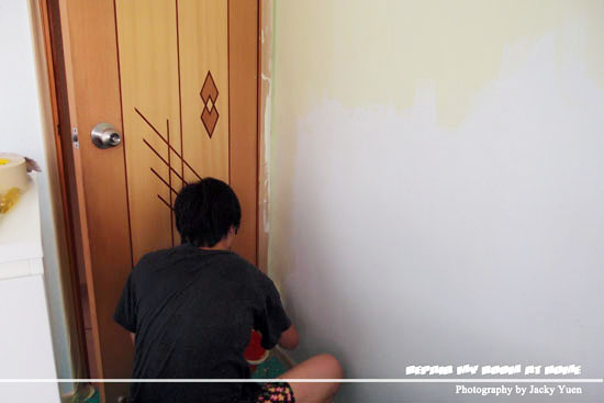 在上色前,先為窗子、冷氣機、、門子、插頭等等用保護貼包好;