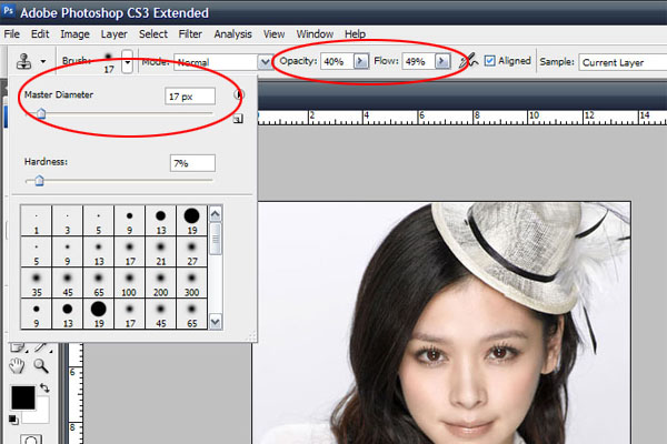 先把透明度Opacity及FLOW減低到38%~50%左右,這樣出來就會有些少透明的效果;