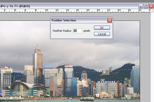 其後就把焦點那個範圍選下來後(應該是一段、一條線直過的),就選 Select -> Modify -> Feather (羽化);做這個的目的是為了其後做矇矓後,主體和矇矓間之連接,不做這個的話,就會出現一些奇怪的現象,這個就留給你們試試了。