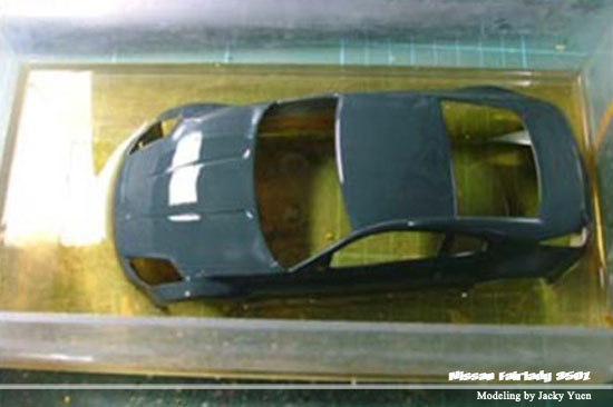 找一個缸(容器)可以把你要洗油的東西放得下的,當然還要不會漏水喔!然後把煞車油倒下去,再將要脫漆的車殼放下去。靜置幾個小時。(因為我買時沒有1公升,所以買了一支細的,要不停倒油到車頂上喔)
